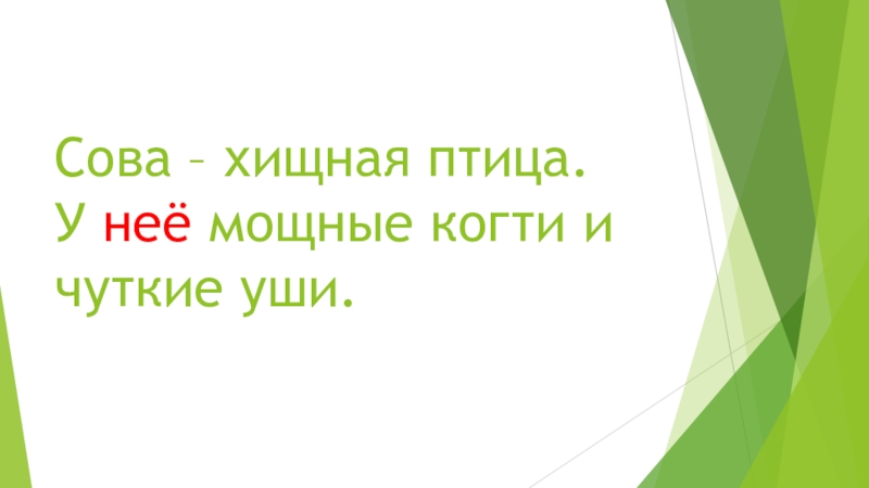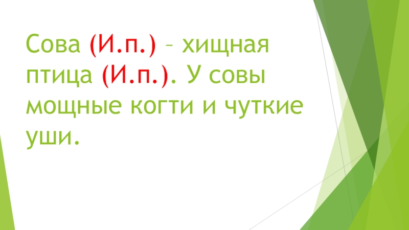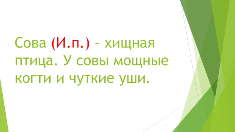 Сова (И.п.) – хищная птица (И.п.). У совы мощные когти и чуткие уши.
