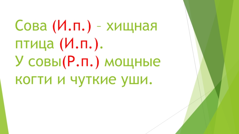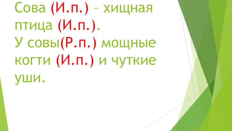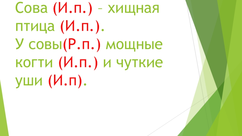 Слайд 13Сова (И.п.) – хищная птица (И.п.). У совы(Р.п.) мощные когти (И.п.)