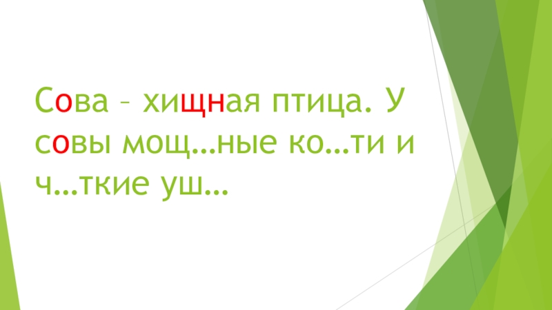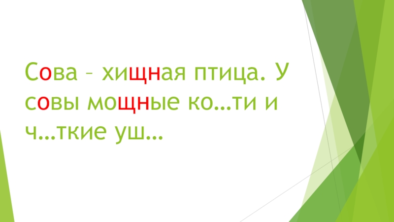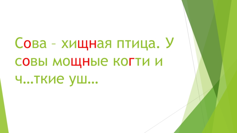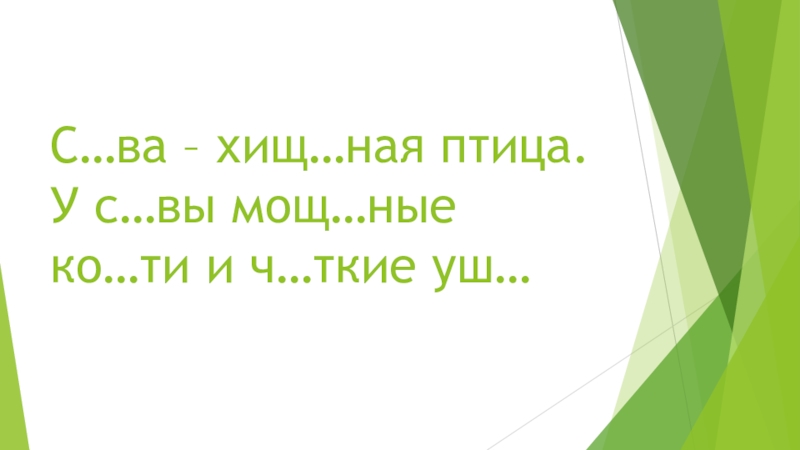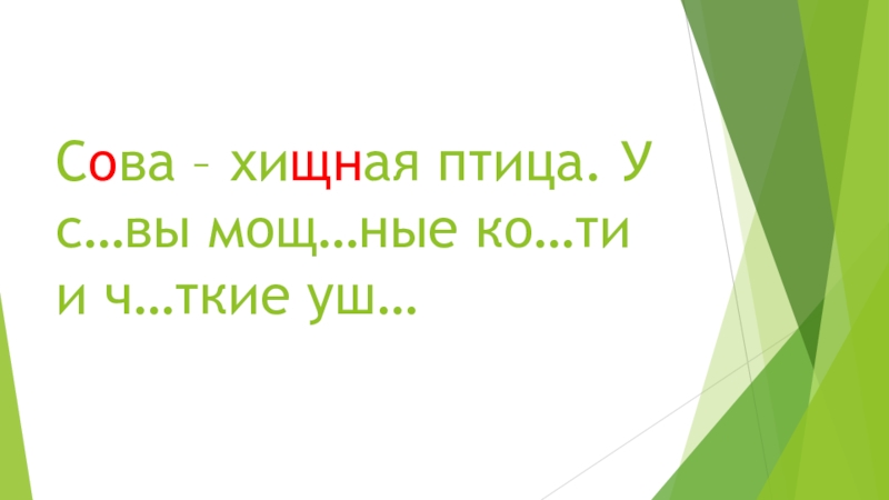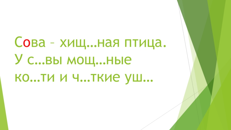 Слайд 4Сова – хищная птица. У с…вы мощ…ные ко…ти и ч…ткие уш…