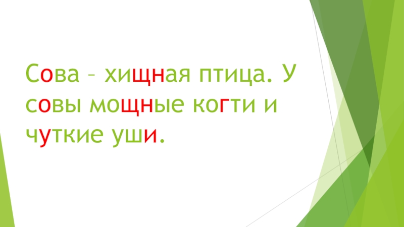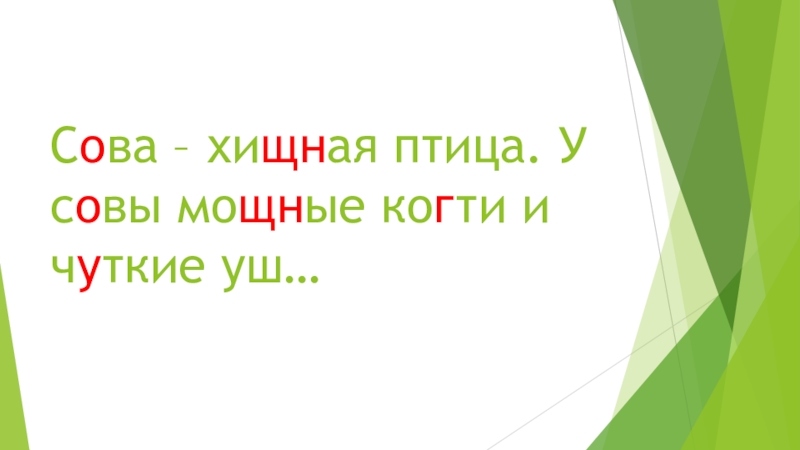 Слайд 5Сова – хищная птица. У совы мощ…ные ко…ти и ч…ткие уш…