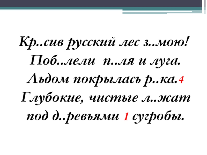 Кр..сив русский лес з..мою! Поб..лели п..ля и луга. Льдом покрылась р..ка.4 Глубокие, чистые л..жат под д..ревьями