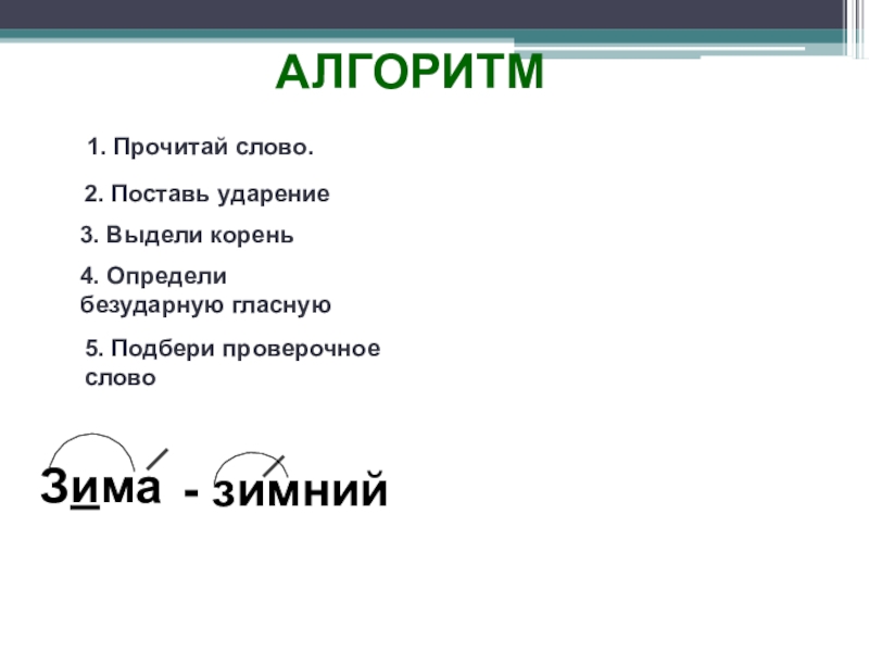 Зима- зимнийАЛГОРИТМ1. Прочитай слово.2. Поставь ударение3. Выдели корень4. Определи безударную гласную 5. Подбери проверочное слово