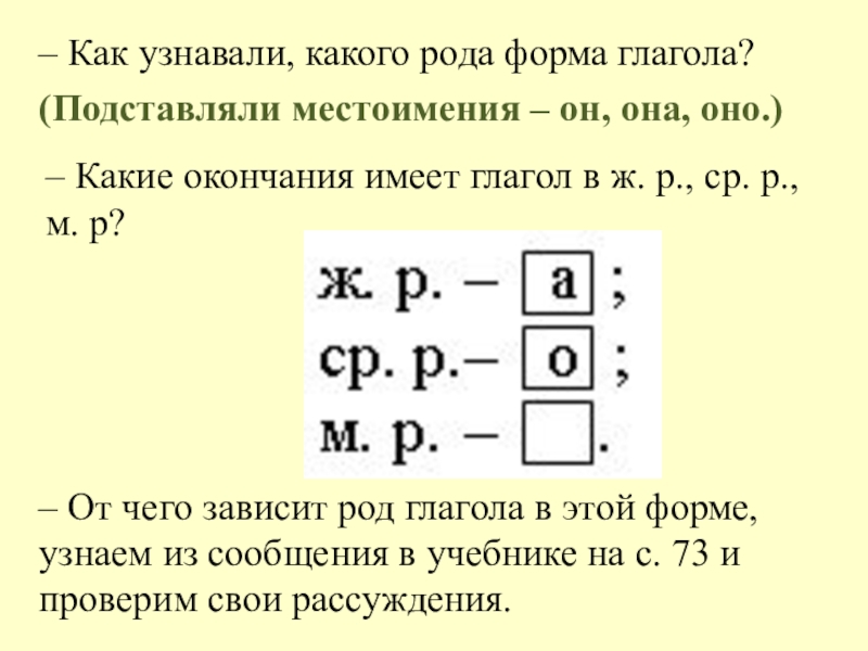 – От чего зависит род глагола в этой форме, узнаем из сообщения в учебнике на с. 73 и проверим свои рассуждения.