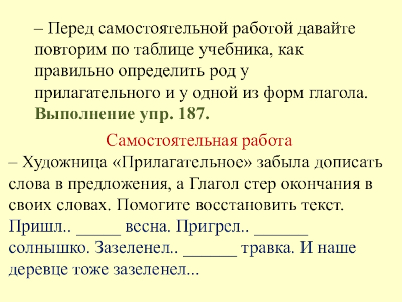 – Художница «Прилагательное» забыла дописать слова в предложения, а Глагол стер окончания в своих словах. Помогите восстановить текст.