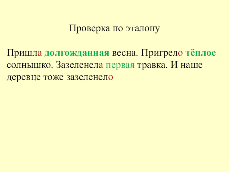 Пришл.. _____ весна. Пригрел.. ______ солнышко. Зазеленел.. ______ травка. И наше деревце тоже зазеленел...