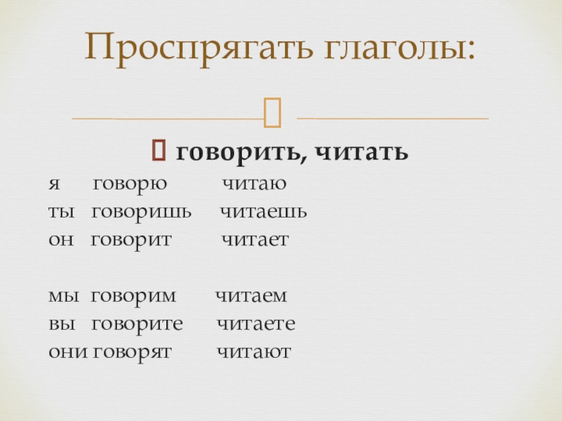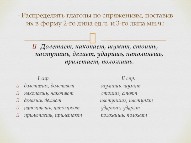 - Распределить глаголы по спряжениям, поставив их в форму 2-го лица ед.ч. и 3-го лица мн.ч.: