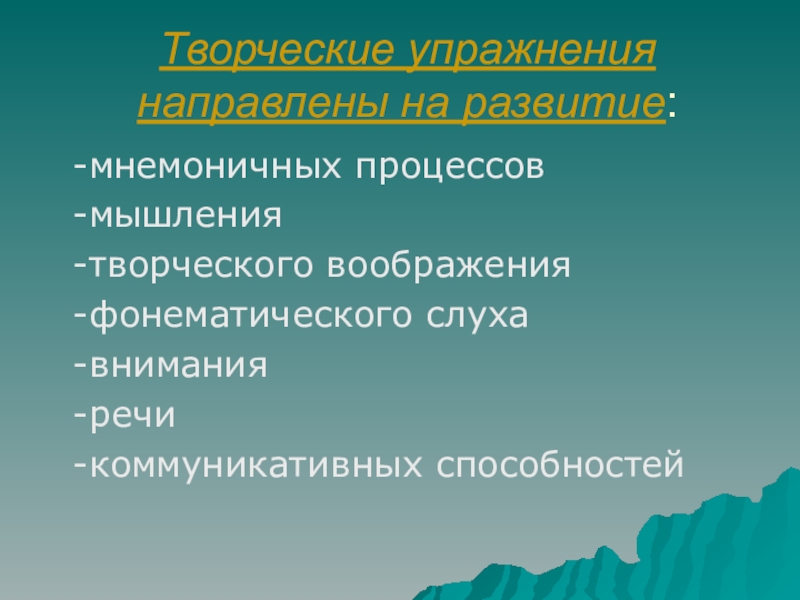 Слайд 4Творческие упражнения направлены на развитие: