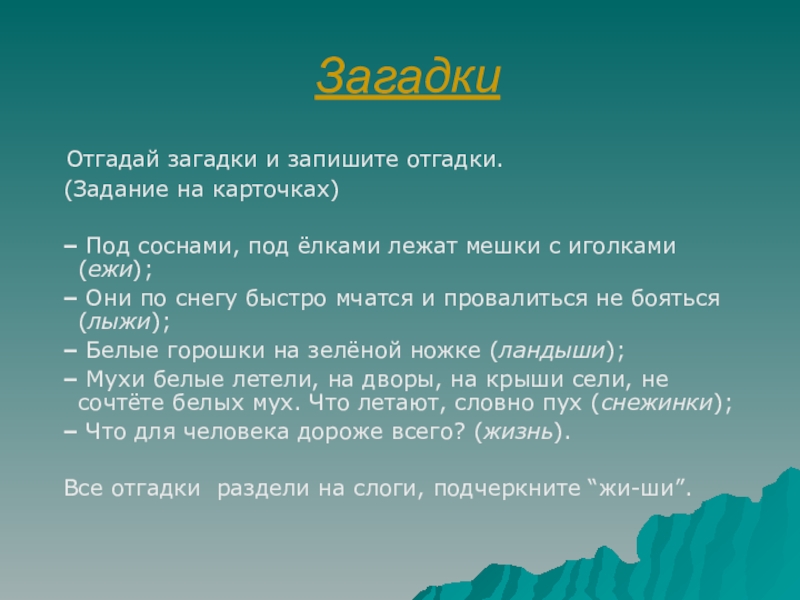 Все отгадки раздели на слоги, подчеркните “жи-ши”.
