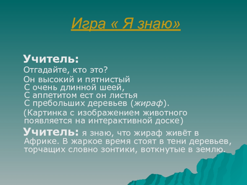 Учитель: я знаю, что жираф живёт в Африке. В жаркое время стоят в тени деревьев, торчащих словно зонтики, воткнутые в землю.
