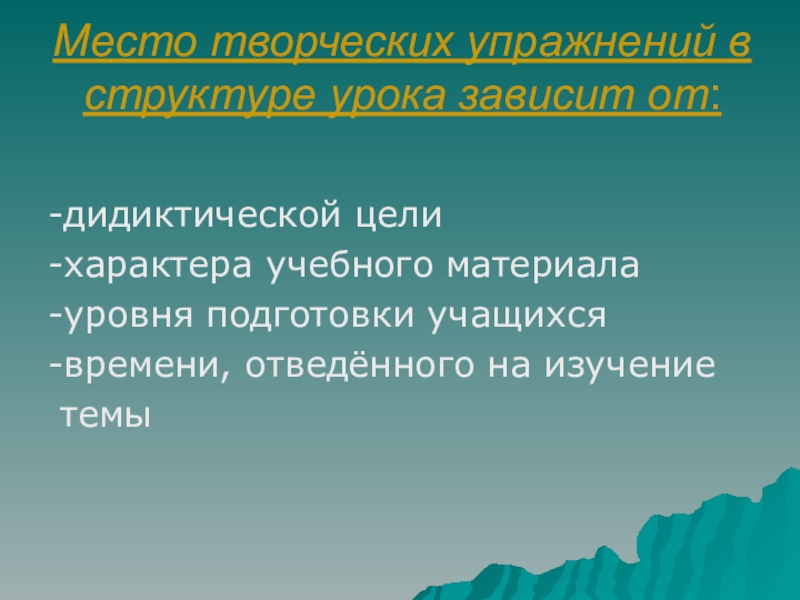 Слайд 5Место творческих упражнений в структуре урока зависит от: