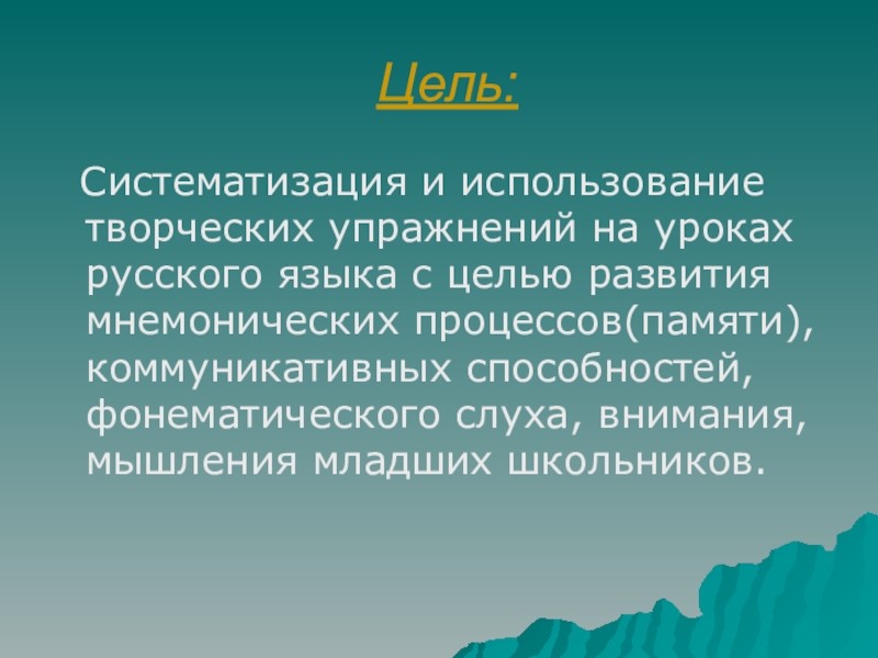 целью развития мнемонических процессов(памяти),коммуникативных способностей, фонематического слуха, внимания, мышления младших школьников.