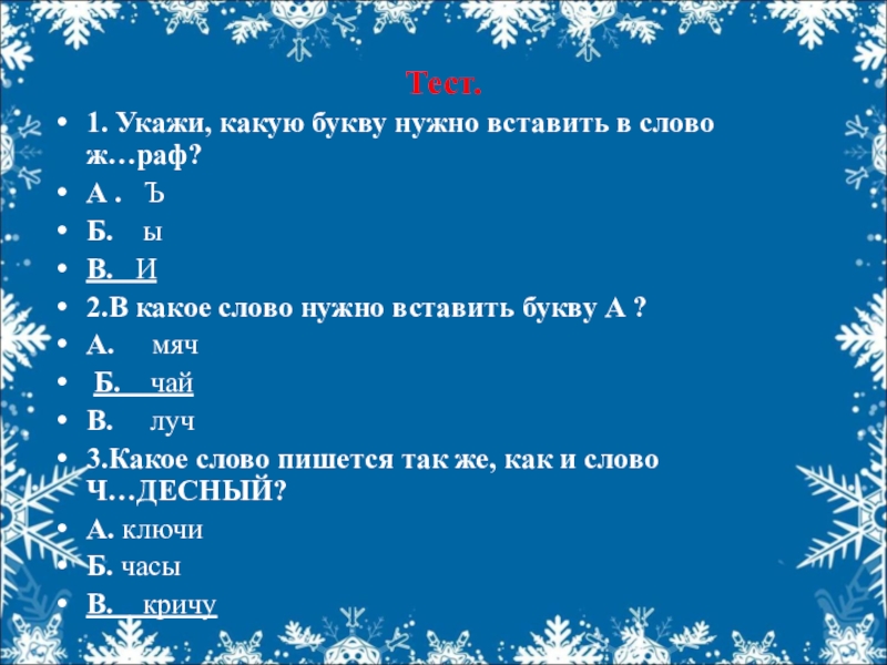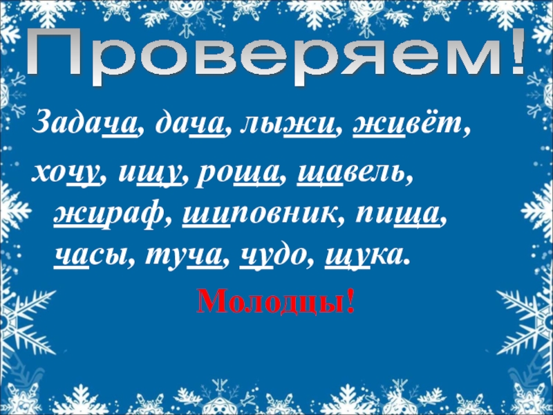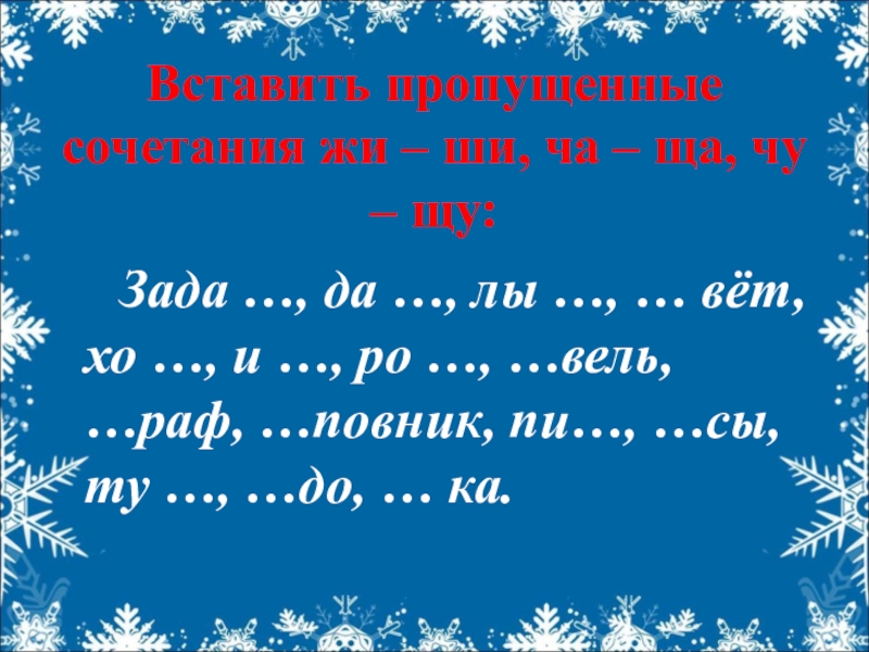 Зада …, да …, лы …, … вёт, хо …, и …, ро …, …вель, …раф, …повник, пи…, …сы, ту …, …до, … ка.