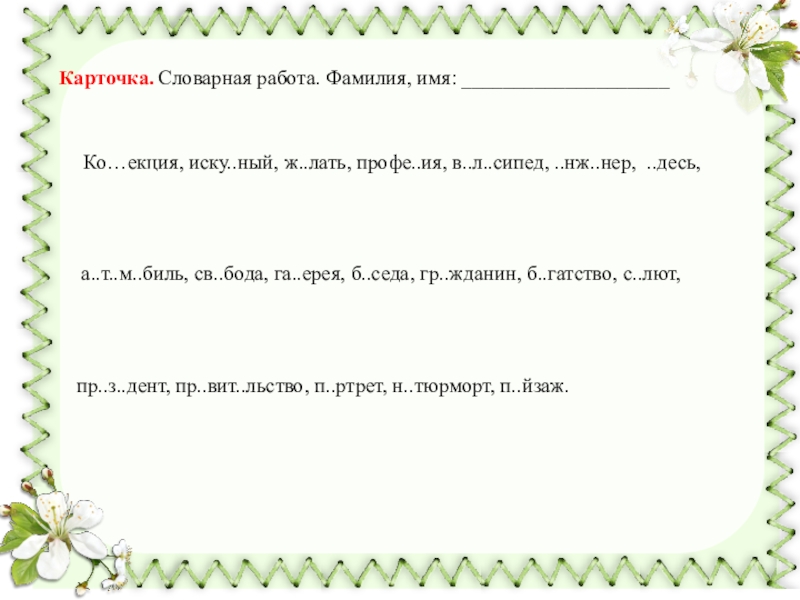 Карточка. Словарная работа. Фамилия, имя: ____________________ Ко…екция, иску..ный, ж..лать, профе..ия, в..л..сипед, ..нж..нер, ..десь, а..т..м..биль, св..бода, га..ерея, б..седа,