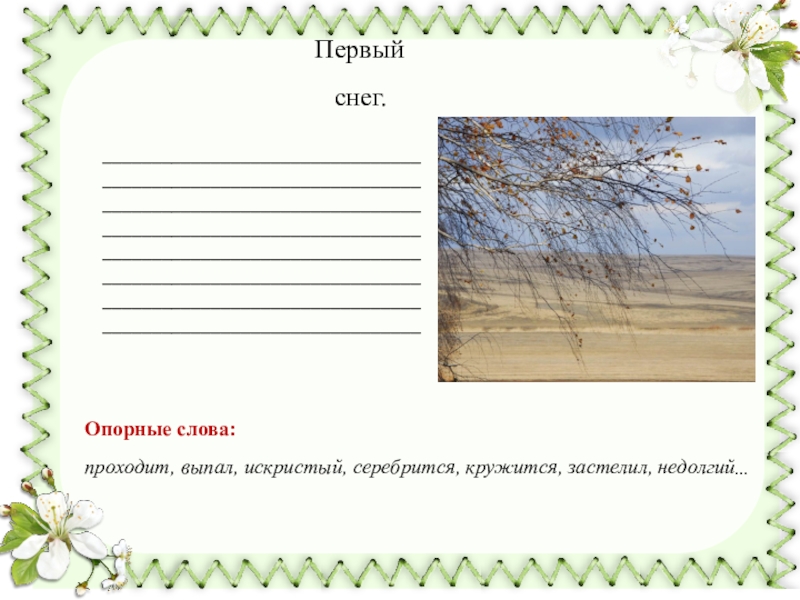Первый снег.Опорные слова: проходит, выпал, искристый, серебрится, кружится, застелил, недолгий…________________________________________________________________________________________________________________________________________________________________________________________________________________________________________________________________