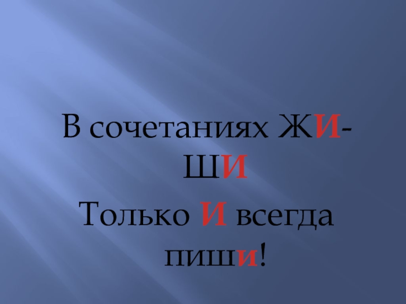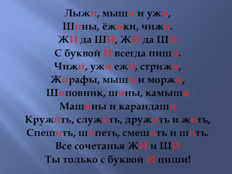 Лыжи, мыши и ужи,Шины, ёжики, чижи.ЖИ да ШИ, ЖИ да ШИС буквой И всегда пиши.Чижи, ужи ежи,