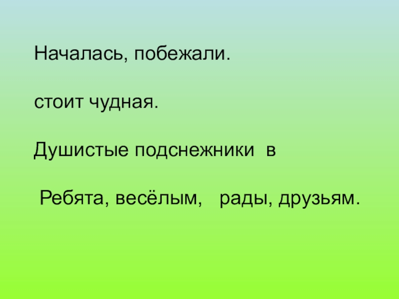 Слайд 6 Началась, побежали. стоит чудная. Душистые подснежники в Ребята, весёлым, рады, друзьям.