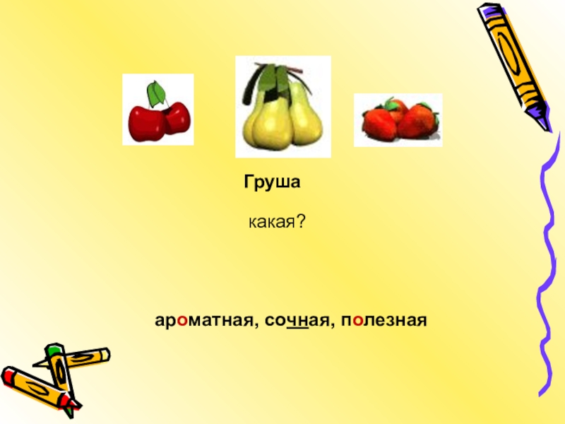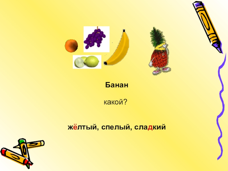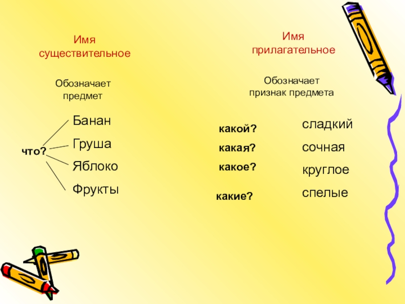 БананГрушаЯблокоФрукты что?Имя существительноеОбозначает предметкакой?какая?какое?какие?сладкийсочнаякруглоеспелыеИмя прилагательноеОбозначает признак предмета