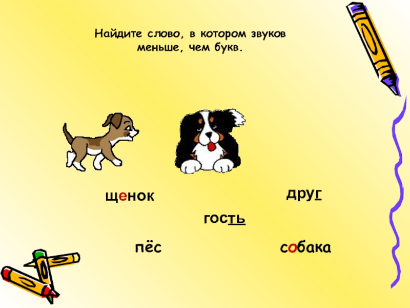 гостьщенокдругсобакапёсНайдите слово, в котором звуков меньше, чем букв.