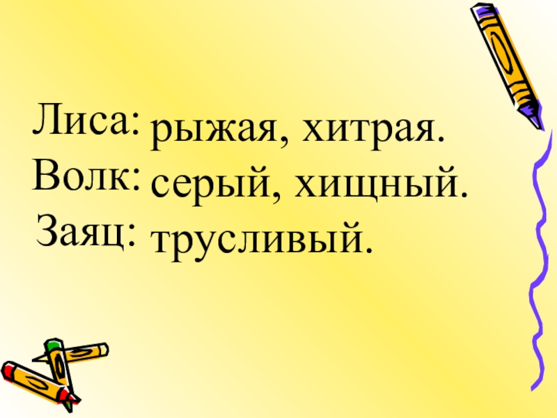 Лиса: Волк: Заяц: рыжая, хитрая. серый, хищный.  трусливый.