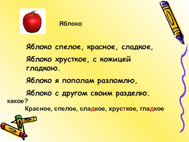 Красное, спелое, сладкое, хрусткое, гладкоеЯблококакое?Яблоко спелое, красное, сладкое,Яблоко хрусткое, с кожицей гладкою.Яблоко я пополам разломлю,Яблоко с другом