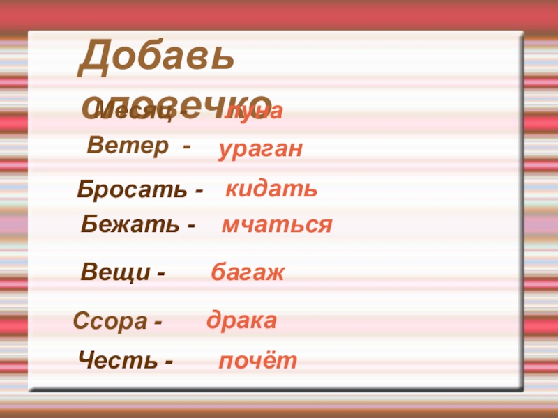 Добавь словечкоМесяц - Ветер - Бросать - Бежать -Вещи - Ссора - лунаураганкидатьмчатьсябагаждракаЧесть - почёт