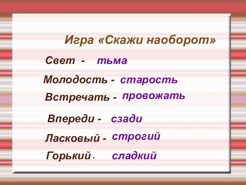 Игра «Скажи наоборот»Свет -Молодость - Встречать - Впереди - Ласковый - Горький -тьмастаростьпровожатьсзадистрогийсладкий