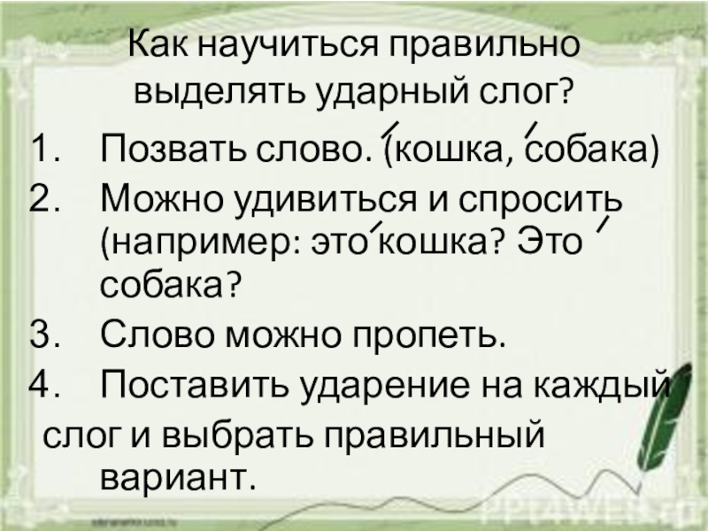 Как научиться правильно выделять ударный слог?Позвать слово. (кошка, собака)Можно удивиться и спросить (например: это кошка? Это собака?Слово