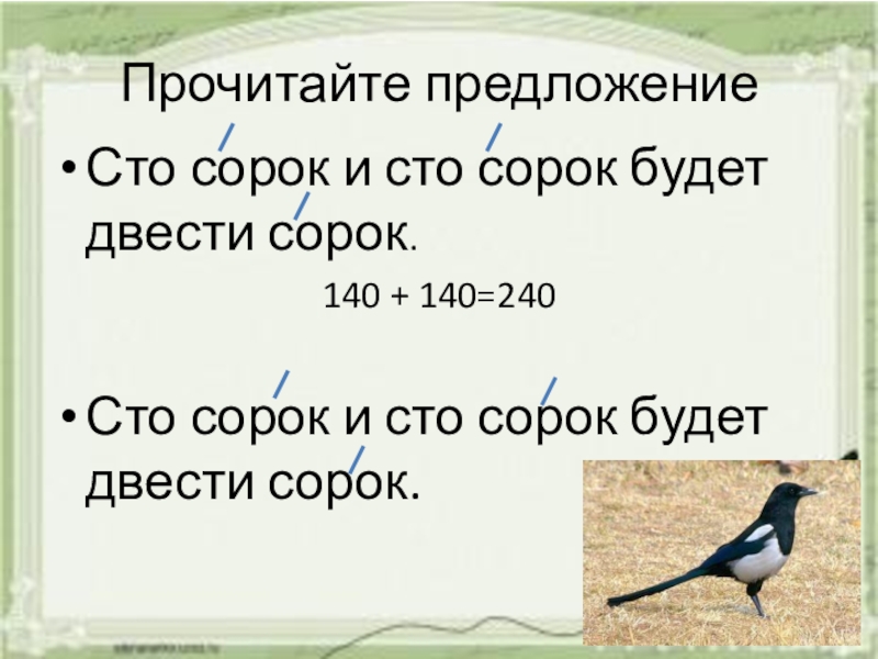Прочитайте предложениеСто сорок и сто сорок будет двести сорок.140 + 140=240Сто сорок и сто сорок будет двести
