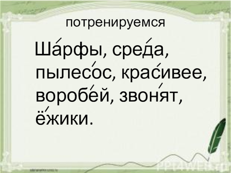 потренируемся  Шарфы, среда, пылесос, красивее, воробей, звонят, ёжики.