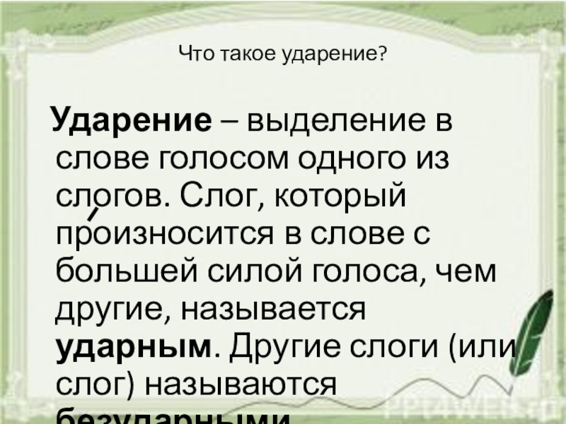 Что такое ударение? Ударение – выделение в слове голосом одного из слогов. Слог, который произносится в слове с большей силой голоса, чем другие, называется ударным. Другие слоги (или слог) называются безударными.