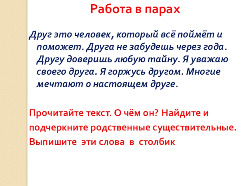 Друг это человек, который всё поймёт и поможет. Друга не забудешь через года. Другу доверишь любую тайну. Я уважаю своего друга. Я горжусь другом. Многие мечтают о настоящем друге.