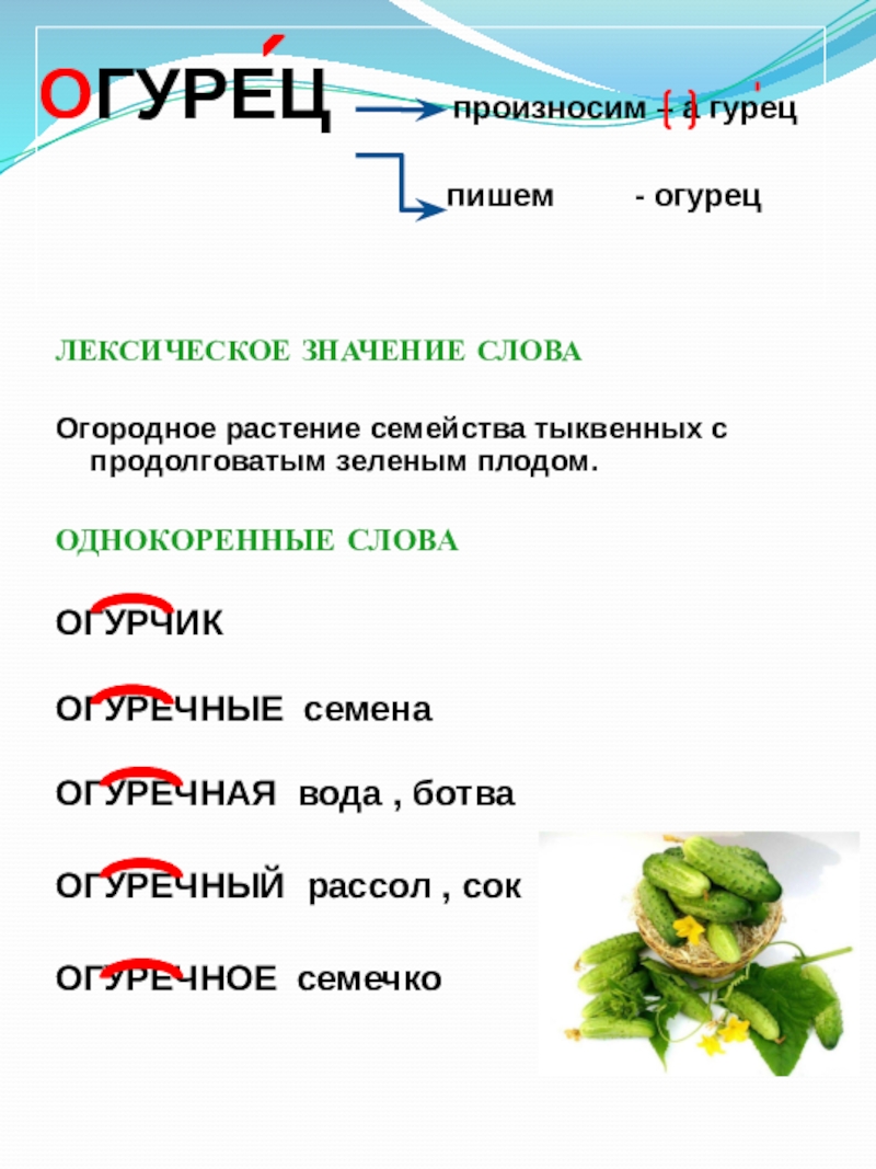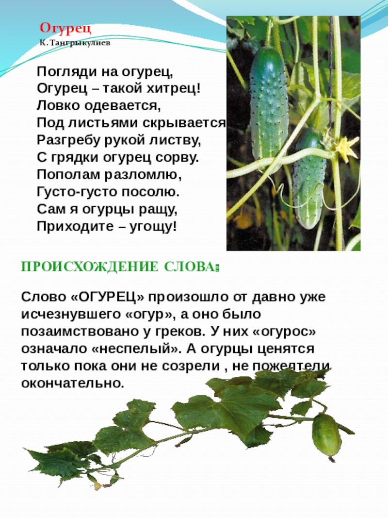 Слово «ОГУРЕЦ» произошло от давно уже исчезнувшего «огур», а оно было позаимствовано у греков. У них «огурос» означало «неспелый». А огурцы ценятся только пока они не созрели , не пожелтели окончательно.