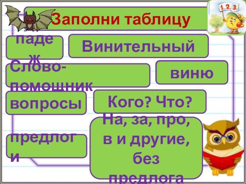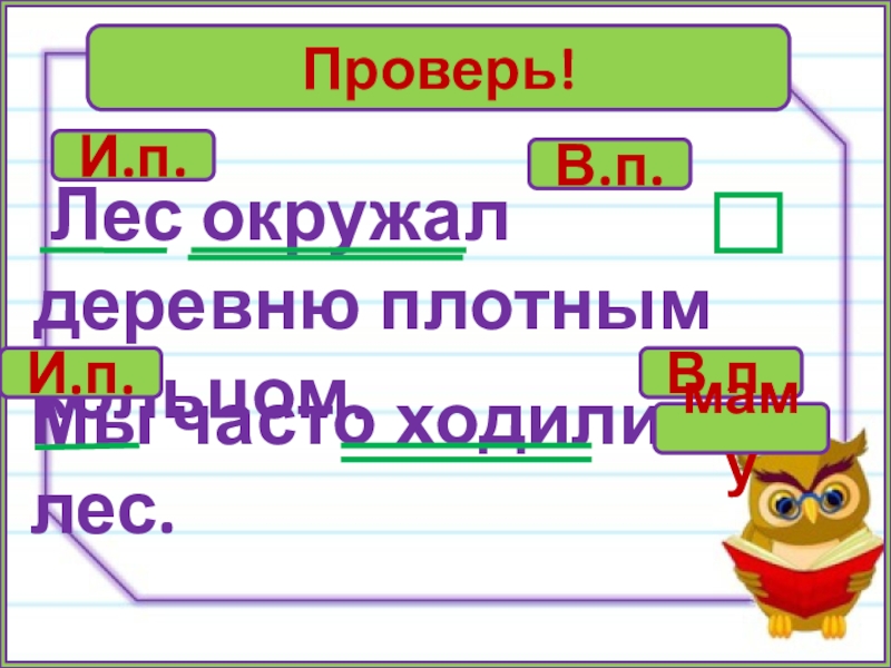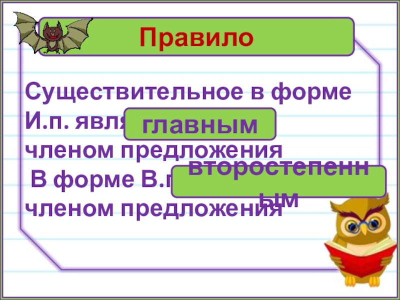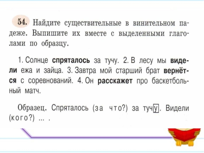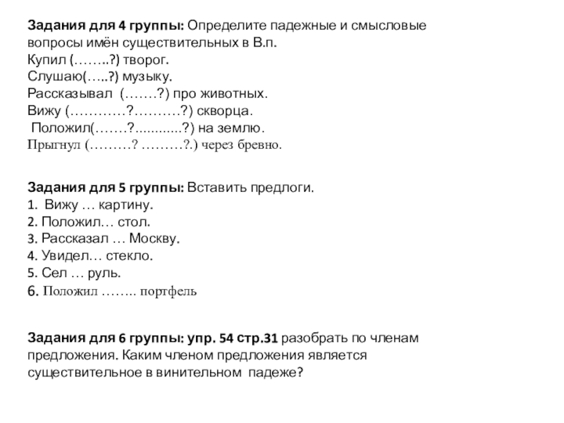 Задания для 6 группы: упр. 54 стр.31 разобрать по членам предложения. Каким членом предложения является существительное в винительном падеже?