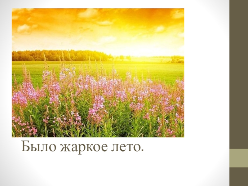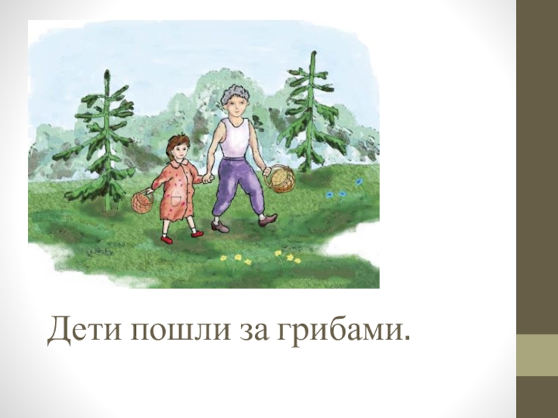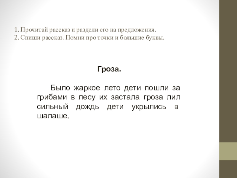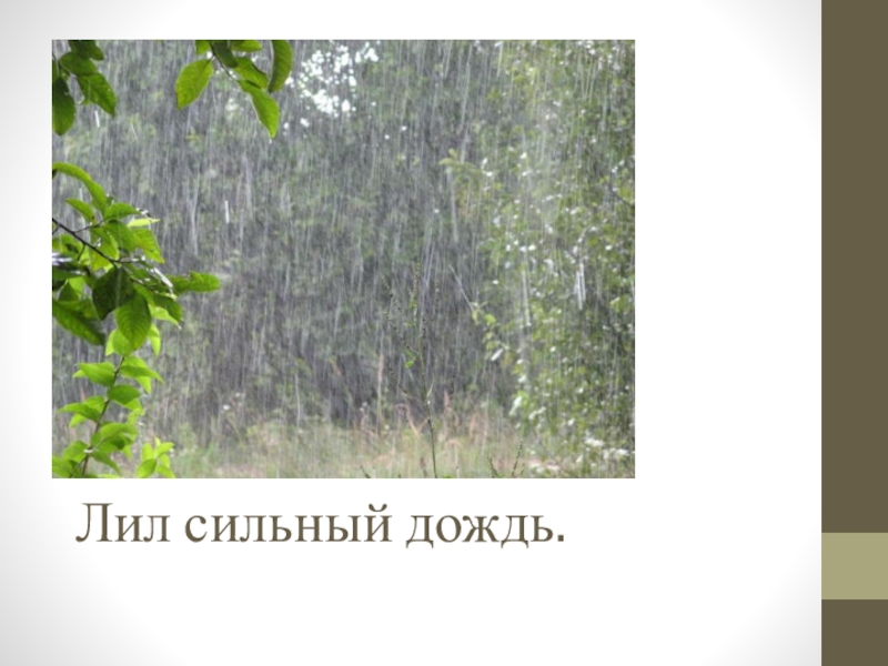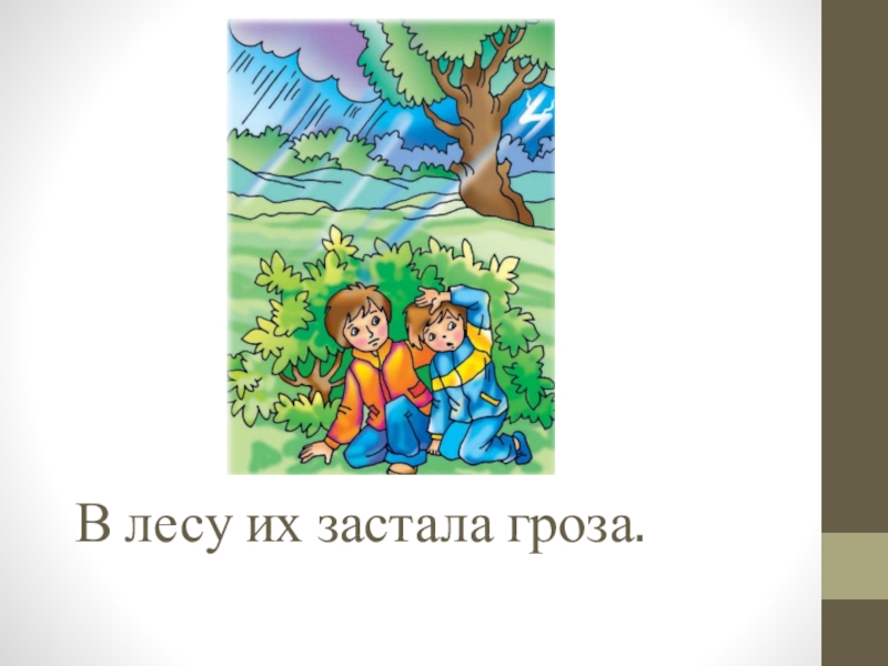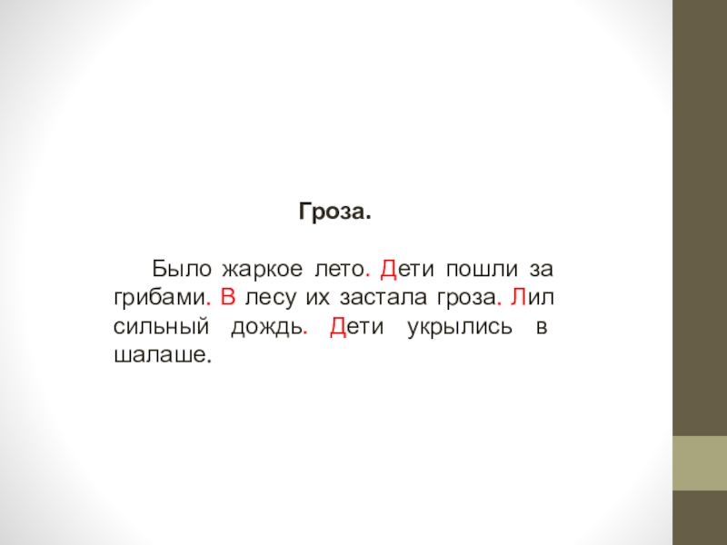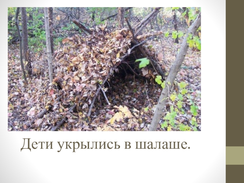 Было жаркое лето. Дети пошли за грибами. В лесу их застала гроза. Лил сильный дождь. Дети укрылись в шалаше.