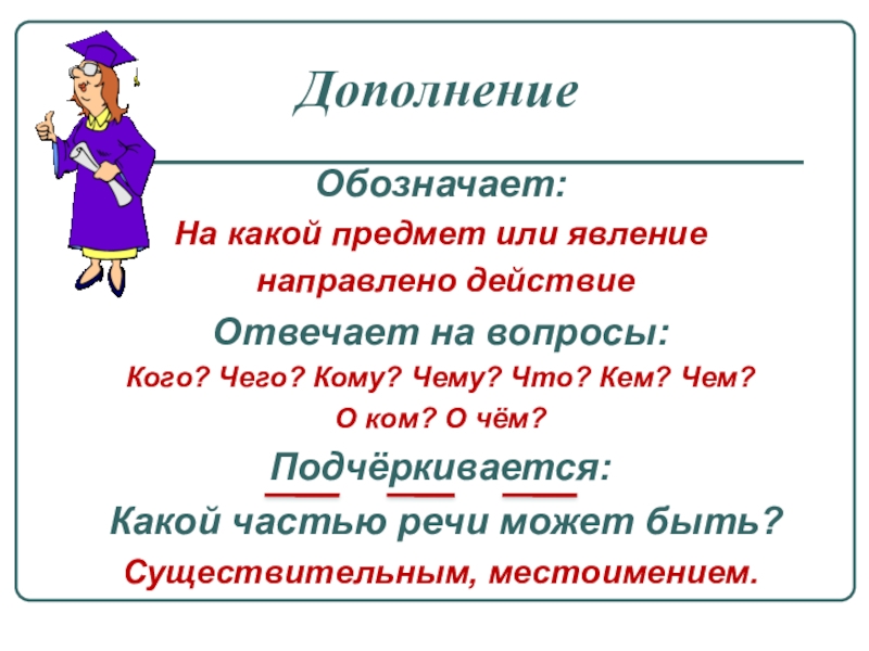 ДополнениеОбозначает:На какой предмет или явление направлено действиеОтвечает на вопросы:Кого? Чего? Кому? Чему? Что? Кем? Чем? О ком?