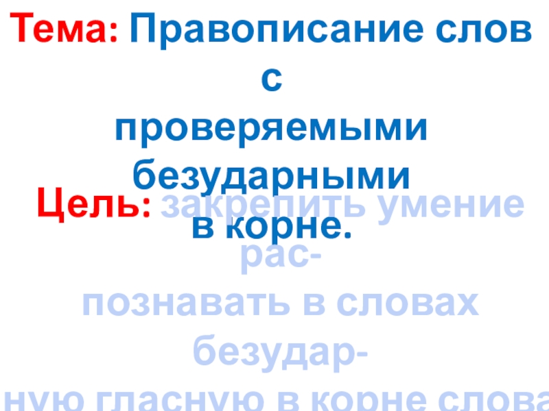 Тема: Правописание слов с проверяемыми безударнымив корне.Цель: закрепить умение рас-познавать в словах безудар-ную гласную в корне слова