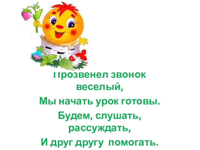 Прозвенел звонок веселый,Мы начать урок готовы.Будем, слушать, рассуждать,И друг другу помогать.