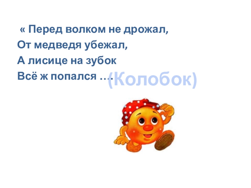 « Перед волком не дрожал,От медведя убежал,А лисице на зубокВсё ж попался ….(Колобок)»