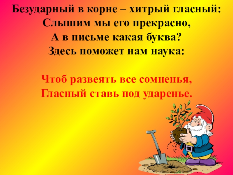 Слайд 28Безударный в корне – хитрый гласный: Слышим мы его прекрасно, А в письме
