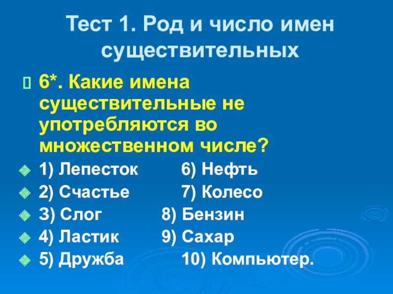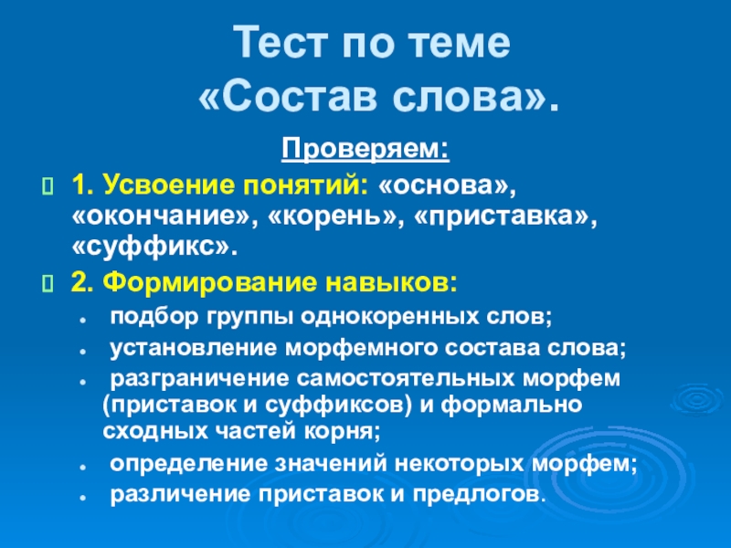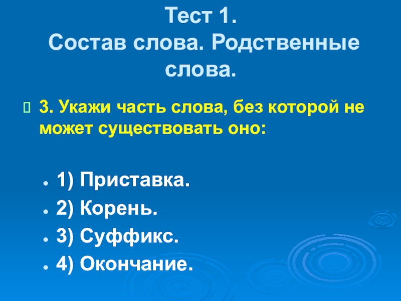 Слайд 8Тест 1. Состав слова. Родственные слова