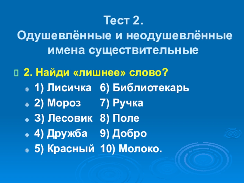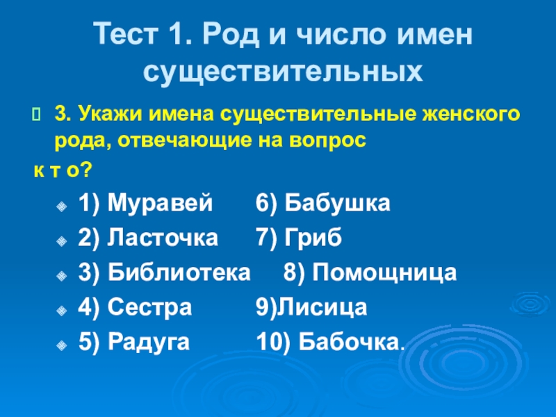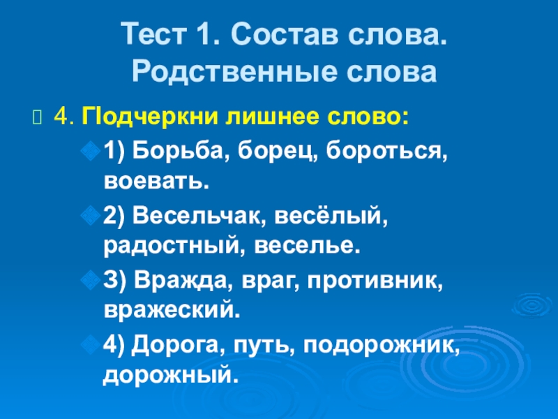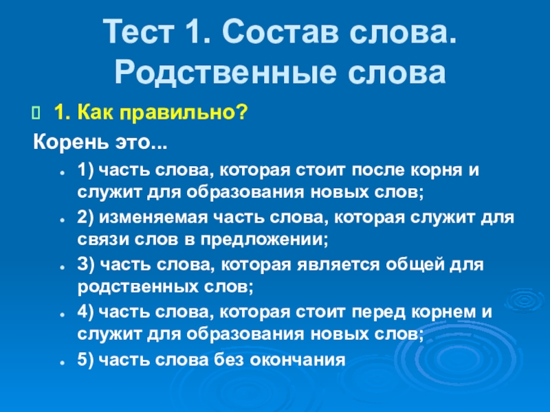 Слайд 5Тест 1. Состав слова. Родственные слова