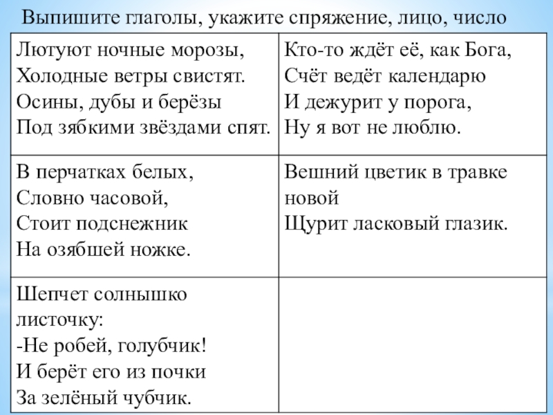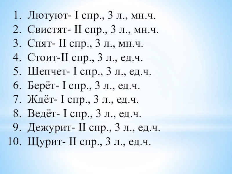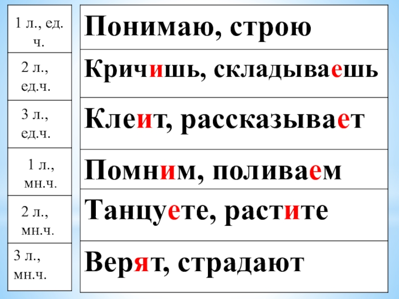 Понимаю, танцуете, кричишь, помним, верят, клеит, строю, поливаем, растите, рассказывает, складываешь, страдают.