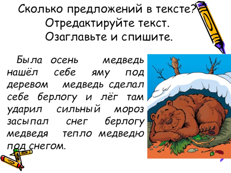 Сколько предложений в тексте? Отредактируйте текст.  Озаглавьте и спишите.Была осень  медведь нашёл себе яму под