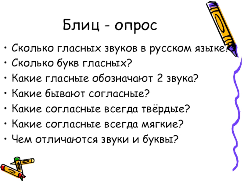 Блиц - опросСколько гласных звуков в русском языке?Сколько букв гласных?Какие гласные обозначают 2 звука?Какие бывают согласные?Какие согласные