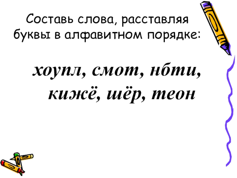 Слайд 10Составь слова, расставляя буквы в алфавитном порядке: