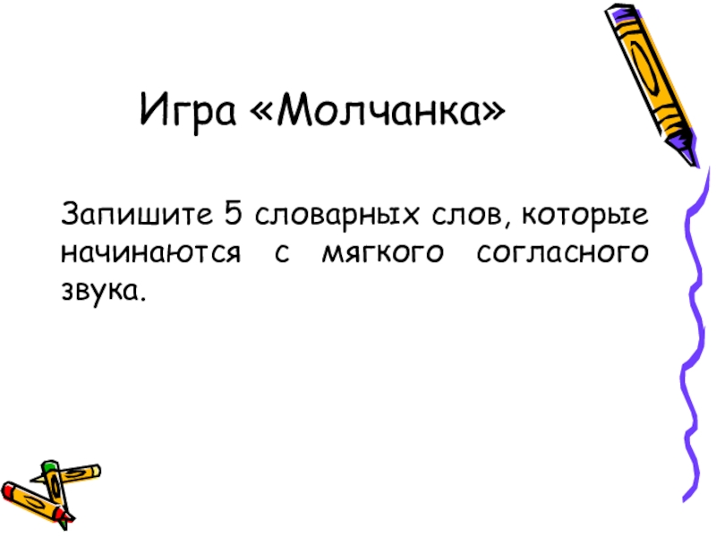 Игра «Молчанка»Запишите 5 словарных слов, которые начинаются с мягкого согласного звука.