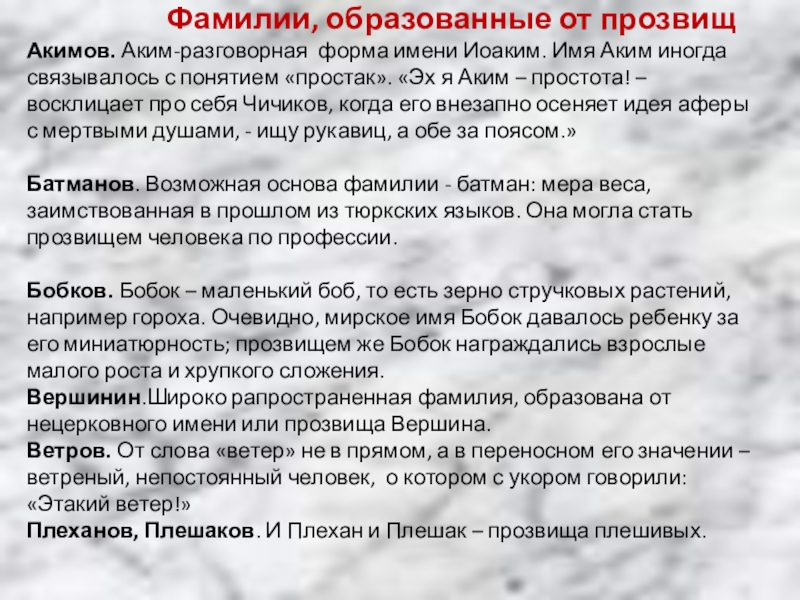 языком много десятилетий, а то и веков назад. Исходное слово отчетливо слышится и легко выделяется, но значение его либо потеряно, либо никак не могло образовать прозвище человека, а затем фамилию.