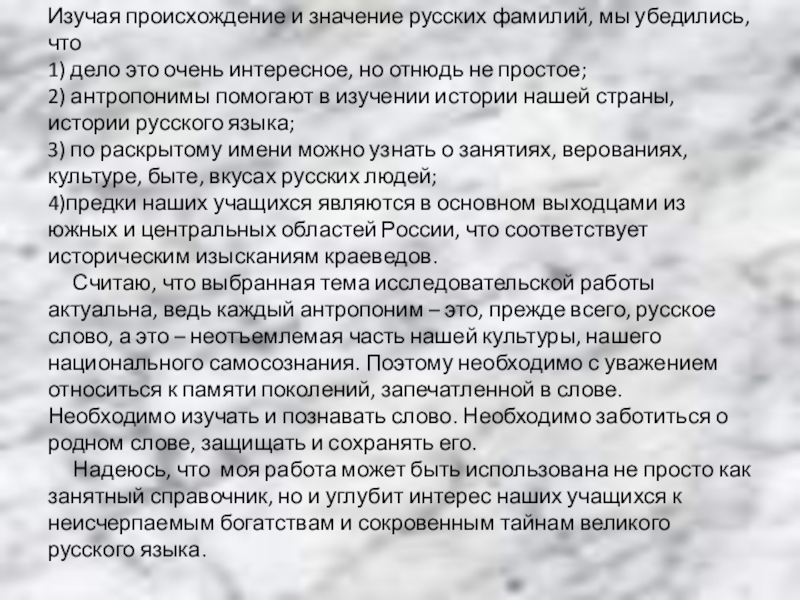 Считаю, что выбранная тема исследовательской работы актуальна, ведь каждый антропоним – это, прежде всего, русское слово, а это – неотъемлемая часть нашей культуры, нашего национального самосознания. Поэтому необходимо с уважением относиться к памяти поколений, запечатленной в слове. Необходимо изучать и познавать слово. Необходимо заботиться о родном слове, защищать и сохранять его.