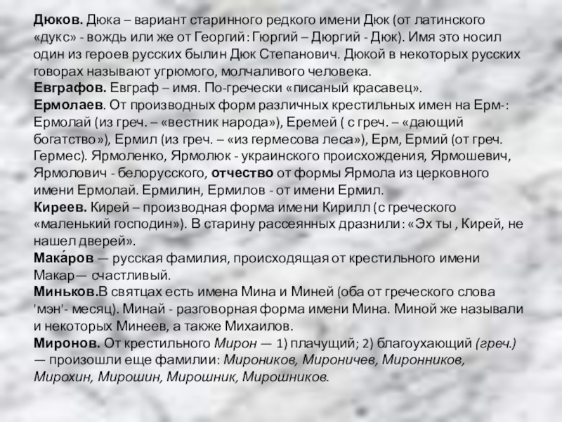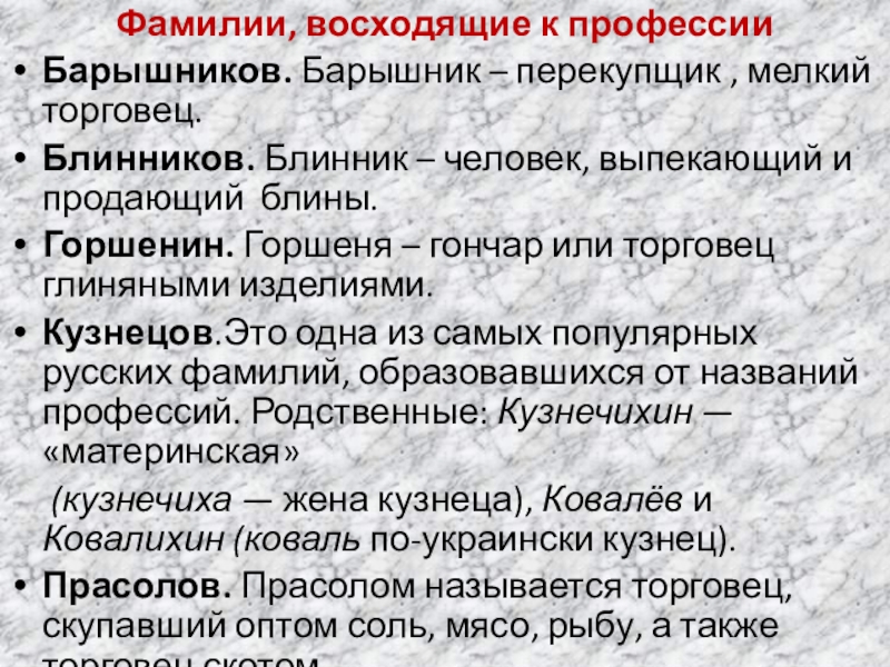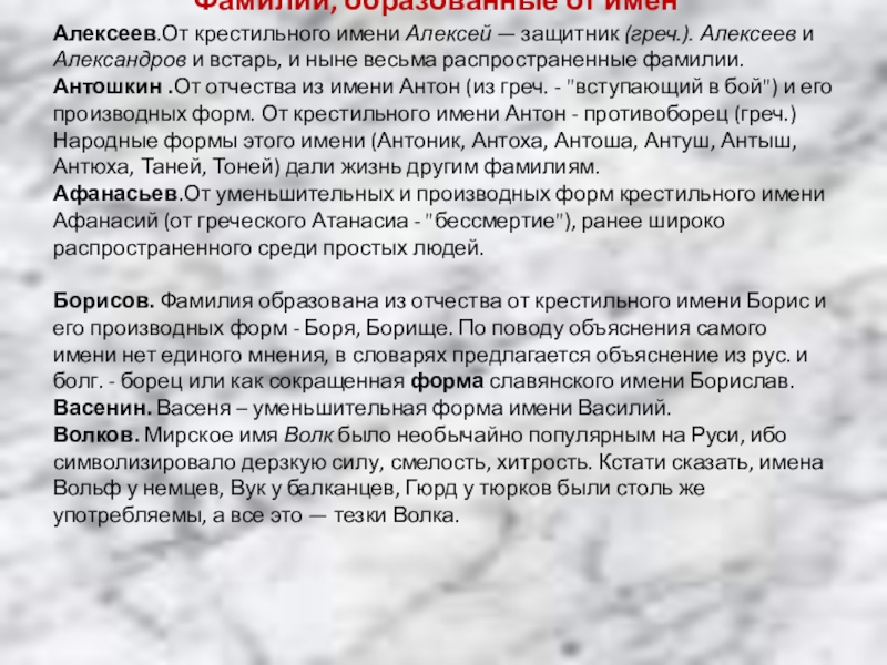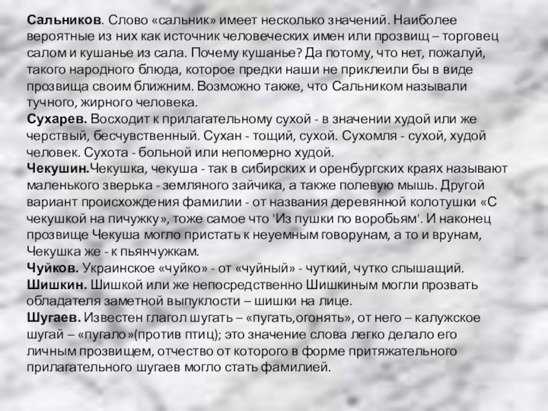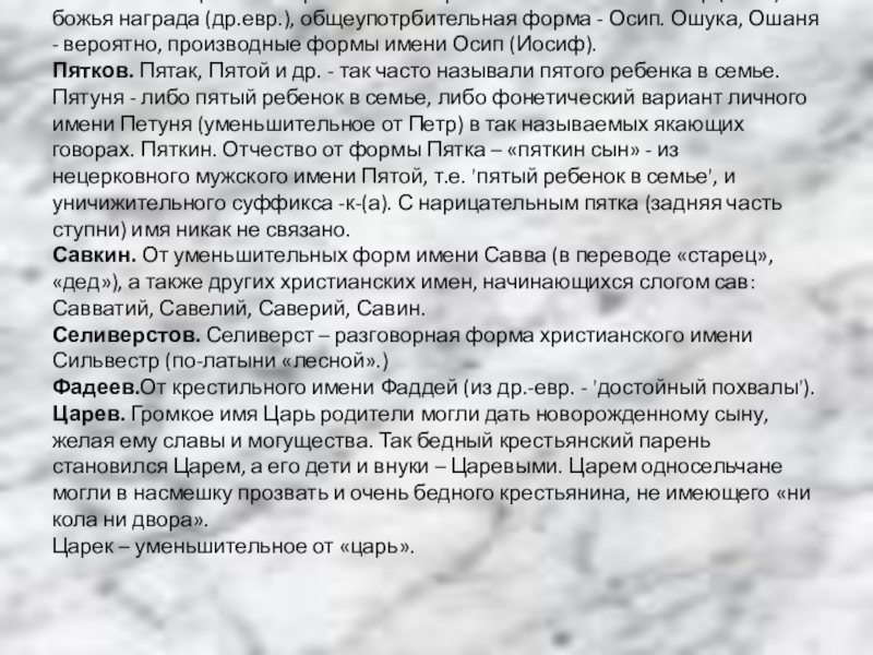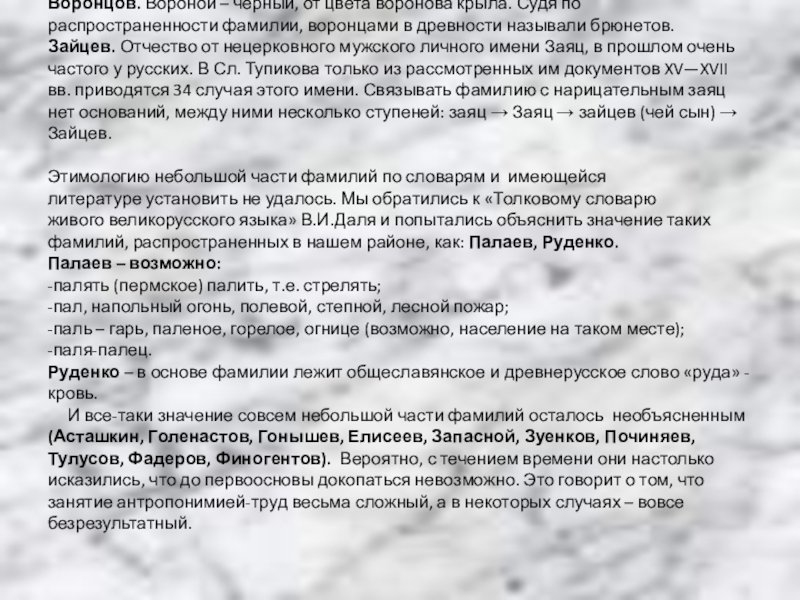 И все-таки значение совсем небольшой части фамилий осталось необъясненным (Асташкин, Голенастов, Гонышев, Елисеев, Запасной, Зуенков, Починяев, Тулусов, Фадеров, Финогентов). Вероятно, с течением времени они настолько исказились, что до первоосновы докопаться невозможно. Это говорит о том, что занятие антропонимией-труд весьма сложный, а в некоторых случаях – вовсе безрезультатный.