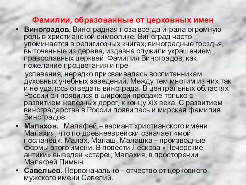 в христианской символике. Виноград часто упоминается в религиозных книгах; виноградные гроздья, выточенные из дерева, издавна служили украшением православных церквей. Фамилия Виноградов, как пожелание процветания и пре-
